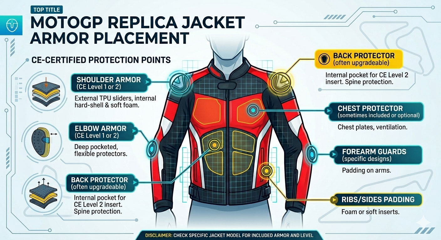 En MotoGP-replikjacka kopierar designen av professionell racingutrustning. Den inkluderar ofta: