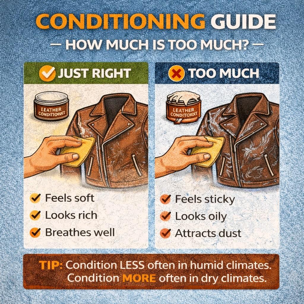 Konditionering håller läder flexibelt. Det ersätter oljor som förloras från värme, svett och tid. Men för mycket balsam gör lädret klibbigt och tungt.
