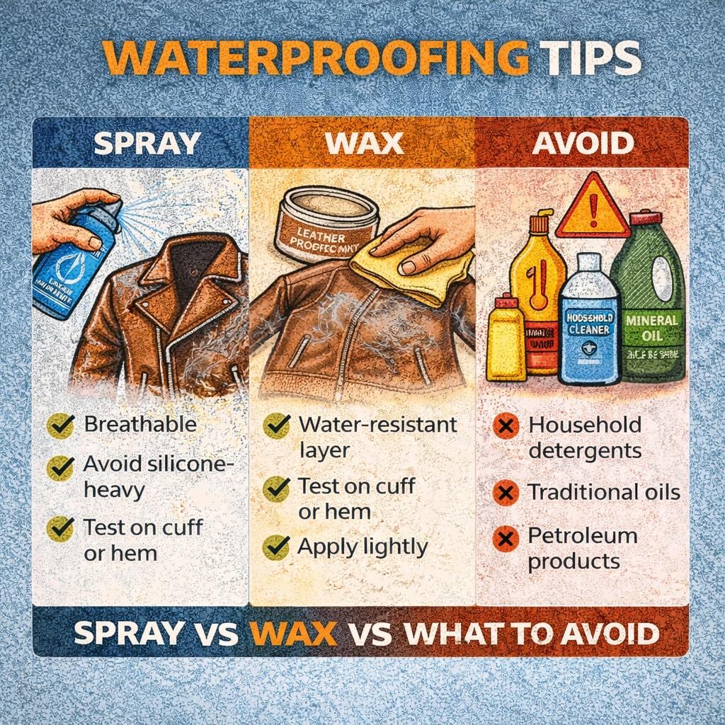 Välj en andningsbar vattenavvisande spray eller vax avsedd för läderutrustning. Undvik silikontunga sprayer som blockerar porerna.