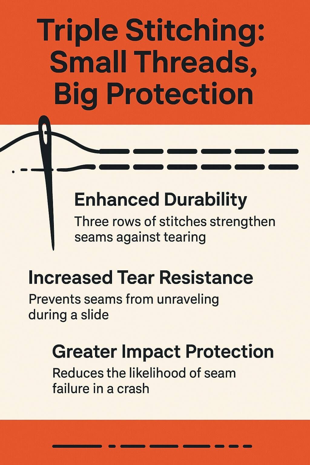 Pantsskydd och läder betyder ingenting om sömmarna går sönder. Vid stötar utsätts sömmarna för massiv belastning. Det är därför trippelsömnad är avgörande för högpresterande dräkter.